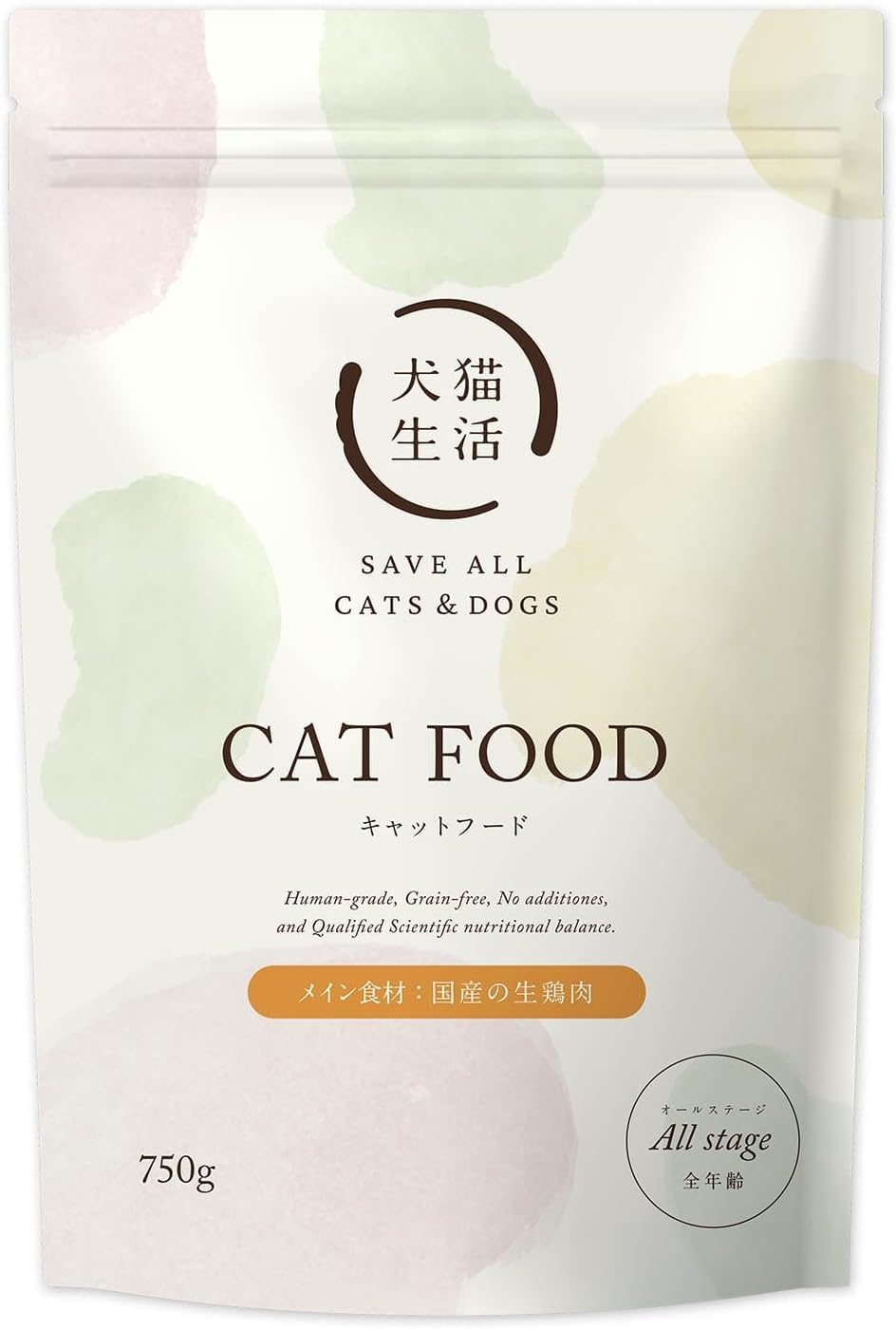 犬猫生活 キャットフード チキンは、獣医師と共同開発した国産グレインフリーキャットフード。国産鶏肉・魚をメイン原料に使用し、人工添加物・香料・着色料を一切使用しない安心設計。子猫からシニアまで全年齢に対応した総合栄養食です。