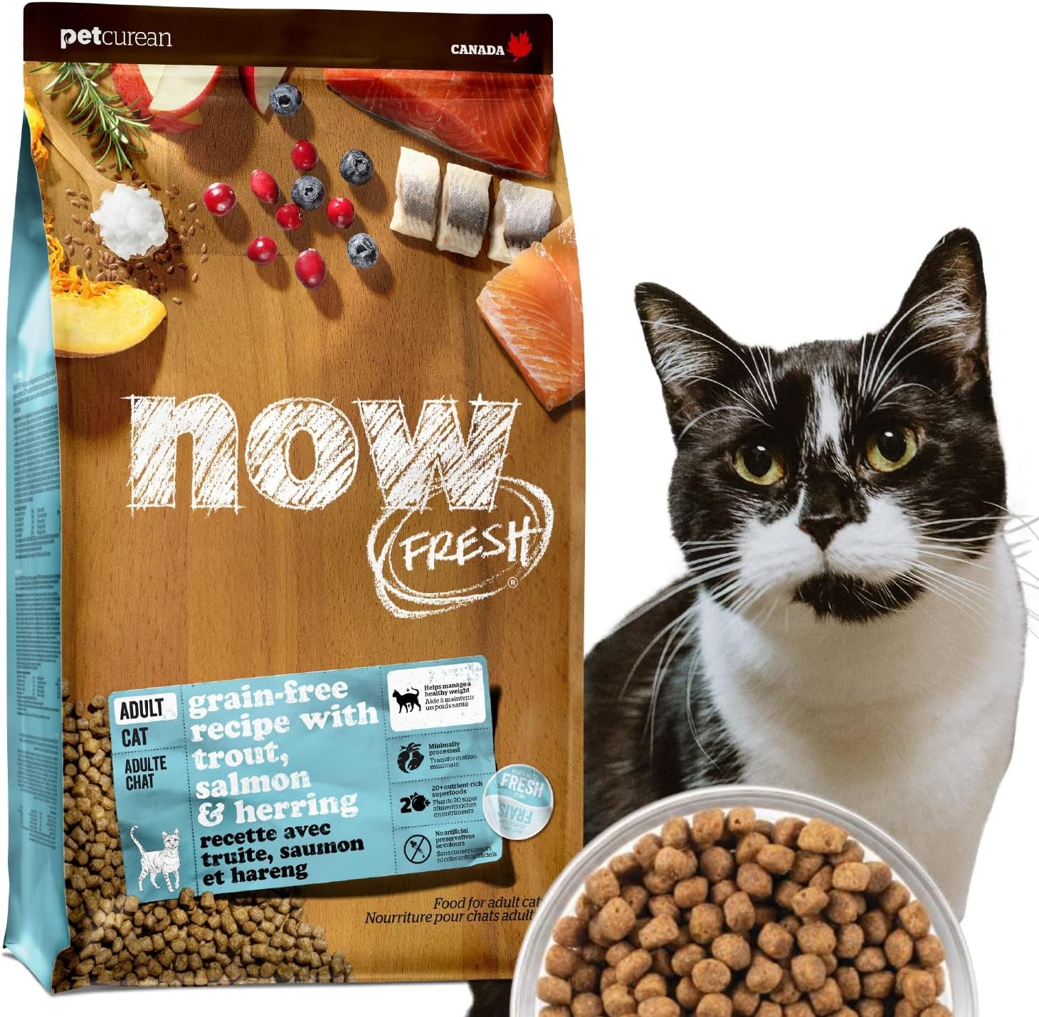 ナウフレッシュ(NOW FRESH)アダルト フィッシュは、カナダ産フレッシュトラウト・サーモン・ニシンを主原料としたグレインフリーキャットフード。「フレッシュ」の名のとおり、生の状態の肉・魚を使用し、ミールフリー・人工添加物不使用を徹底しています。